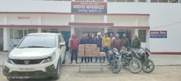 देवरिया। जनपद में अवैध शराब तस्करी और संगठित अपराध के खिलाफ चलाए जा रहे अभियान के तहत पुलिस को बड़ी सफलता हाथ लगी है। थाना बनकटा पुलिस ने मुखबिर की सूचना पर कार्रवाई करते हुए एक चार पहिया वाहन और तीन दोपहिया वाहनों के साथ कुल 126 लीटर अवैध देशी शराब बरामद की है। इस कार्रवाई में छह आरोपियों को गिरफ्तार किया गया है, जिनमें से कई पर पहले से गंभीर आपराधिक मामले दर्ज हैं।
